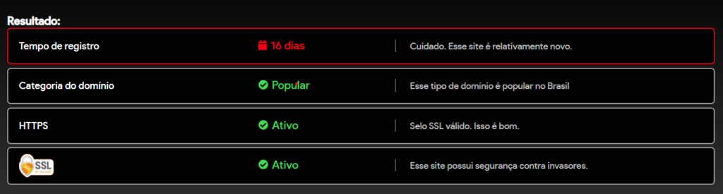 Observação: Nosso site é recente. Por esse motivo, o indicador de tempo de registro aparece em vermelho. Com o passar do tempo, esse indicador tende a mudar automaticamente para verde.